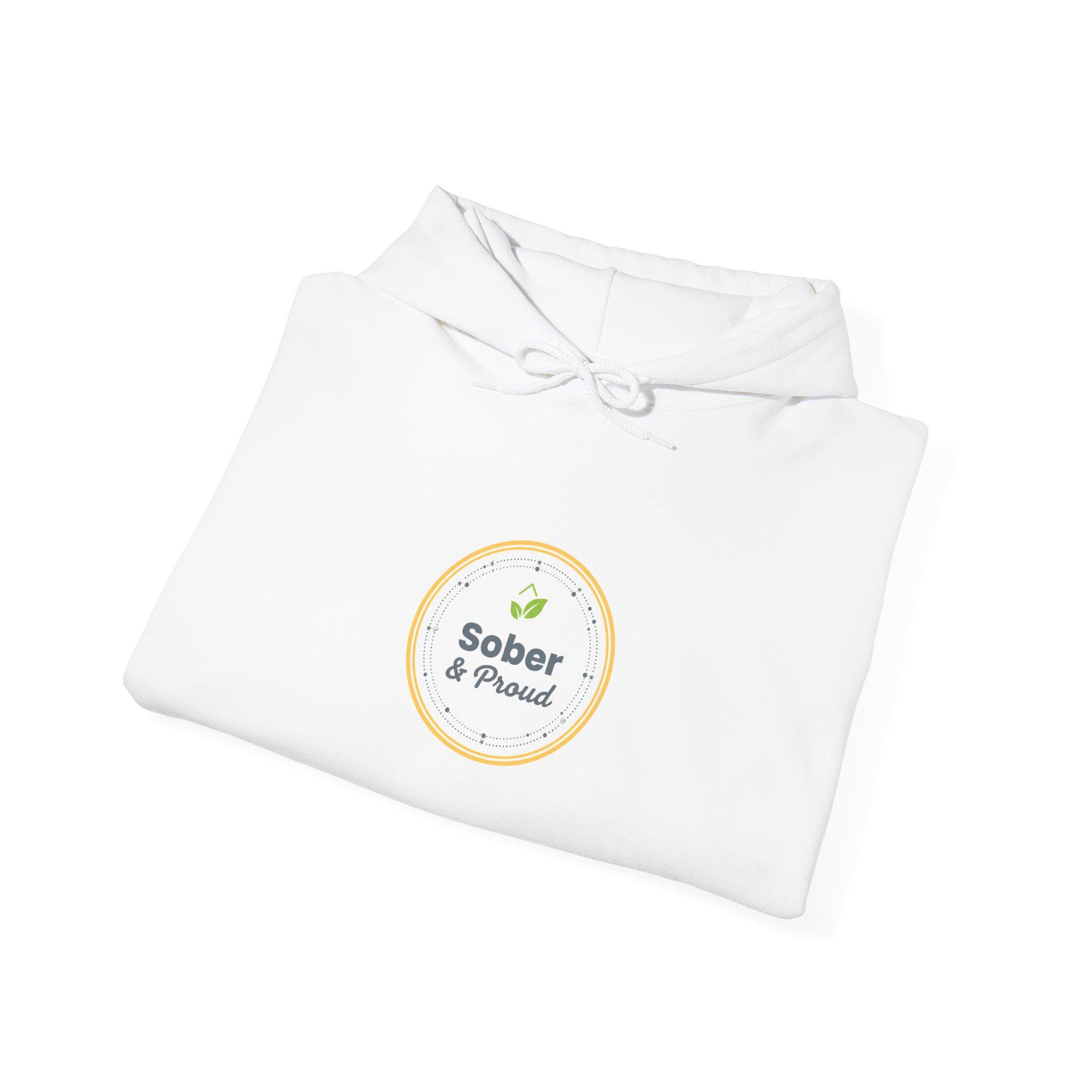 Badge-style ‘Sober & Proud’ emblem on a clean white hooded sweatshirt—a sober-curious piece that blends supportive messaging with light citrus accents. The design reads as a calm, encouraging tracker/badge motif that fits Dry January and alcohol-free wardrobes, using a friendly sans with a subtle script accent to keep the tone approachable and stigma-free. The white background and soft, muted yellow/green pop give it a fresh, wellness-oriented look that works for everyday wear and group meetups.